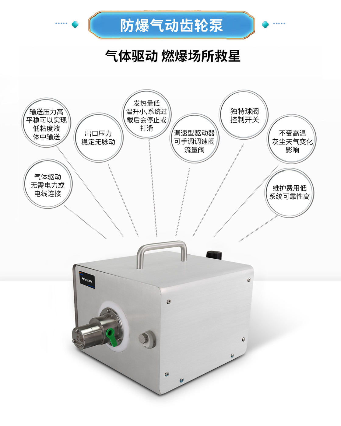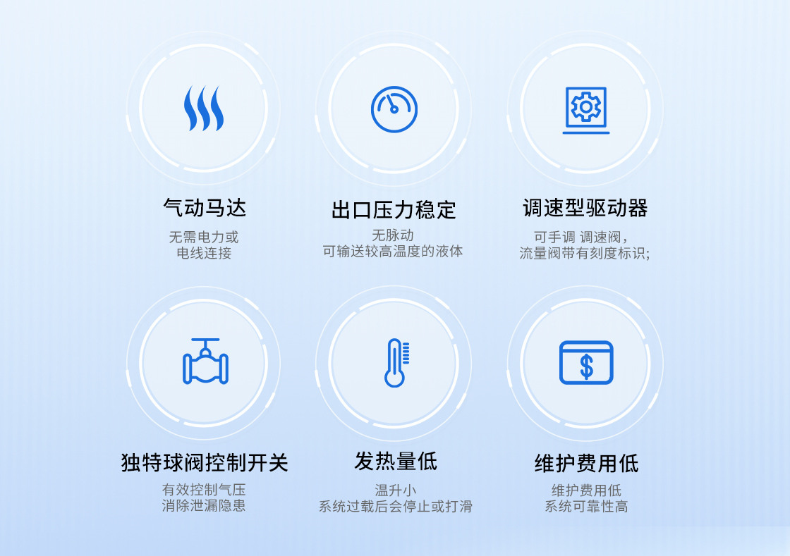 2.氣動防爆輸送壓力高、平穩(wěn),可以實現(xiàn)低粘度液體中高壓輸送;
