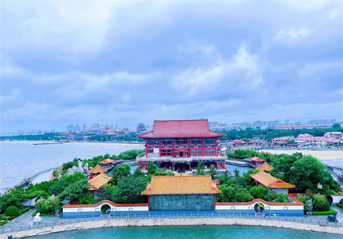 整個(gè)景區(qū)漂浮在大海上,景中有海,海中有景,內(nèi)外海水相連,點(diǎn)點(diǎn)漁帆與岸邊景色相映成趣;玉樓仙閣,祥云繚繞;亭臺(tái)軒榭,步移景異;踏圍廊幽徑,臨海國信風(fēng),聽漁歌唱晚,觀碧波靈光,詩情畫意,不勝陶然。